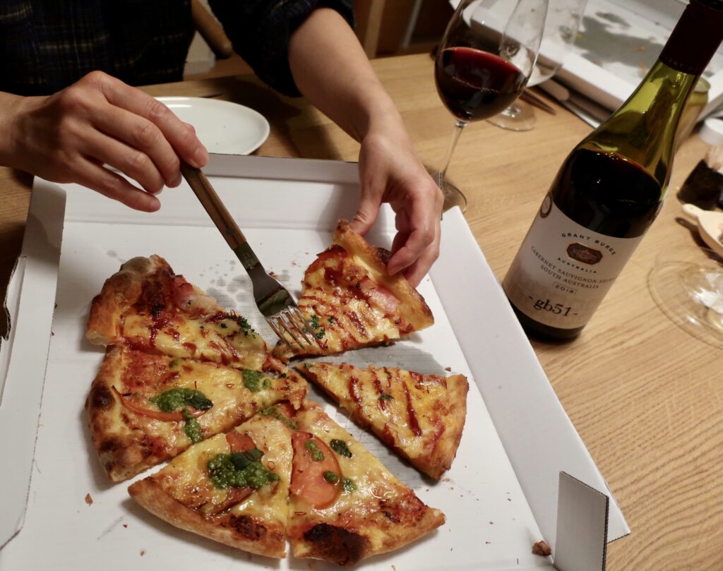 隠居たるもの、時機をうかがい横着をする。長野県にも「まん延防止等重点措置」が適用されることになった。白馬の飲食店は、1月いっぱいは休業、2月に入ってからもまん防の期間である20日までは時短の上に酒類の提供はなし、おおむねこうした営業態勢で足並みをそろえたように見受ける。つれあいが信頼を置き、インスタグラムをフォローしているkoubo-nikkiというパン屋さんがある。そこに「HAKUBA PIZZA が美味しい」と紹介されていた。この際である。いっそのこと白馬での食バリエーションを拡張すべきと考え、2022年1月27日午後6時20分、私たちは近くにあるこのデリバリーショップに夕食を発注するため電話をかけた。