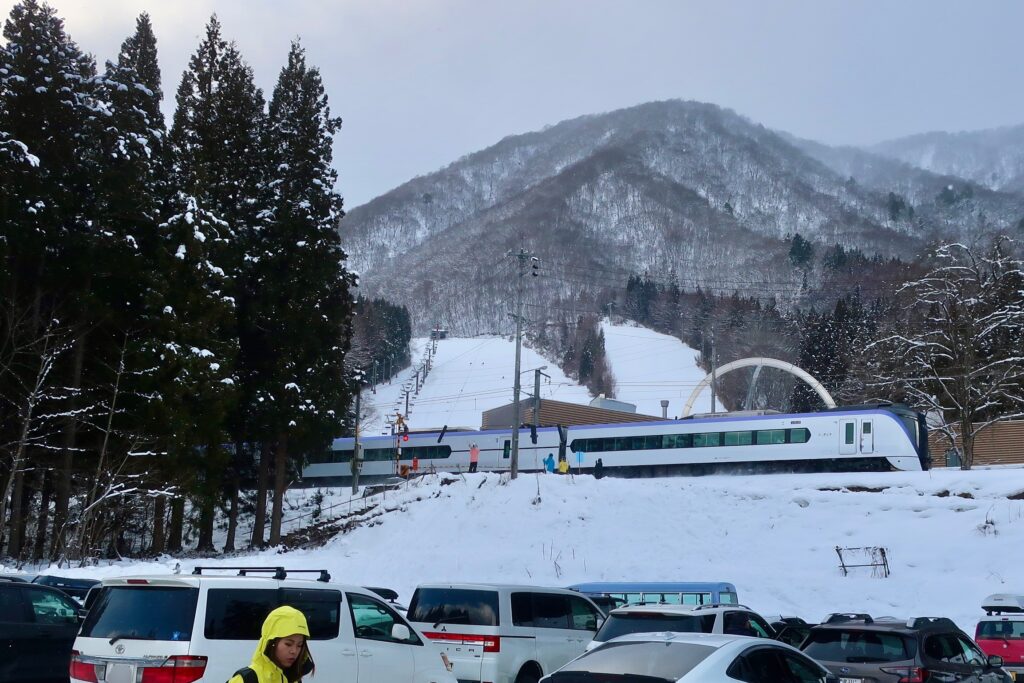 いわば私たちにとって東京から白馬への移動は日常生活の一部であるから、滅多なことがないかぎり白馬まで直行する朝一番8時ちょうどのあずさ5号を利用することはない。無理せずいつもと変わらない時刻に起床し、朝ドラ「ばけばけ」でも観ながら朝食をとり、脱ぎ捨てた寝巻きも含め一切合切を洗濯、午前11時発のあずさ17号に間に合うよう新宿に向かい、松本から鈍行の大糸線に乗り換え六角精児を気取る、これが普段のパターンだ。ところが12月から2月あたりまではそういうわけにいかない。日が暮れるのが早いところにもってきて散種荘に着くなりやらなければならないことが目白押しだ。凍結を避けるために水抜きしていた水道管にまず水を通さないかぎり生活を始められない。水回りに支障がないことを確認した後、冷え切った室内を急いで暖めなくては上着を脱ぐこともままならない。だから何かあっても対処できるよう日の高いうちに白馬に到着すべく、冬の間は少しがんばって8時ちょうどのあずさ5号の乗客となる。するとなると「ギリギリでもとにかく飛び乗りさえすれば」などとのんきなことを言ってはいられない。悠長に構えていると座席上部の棚をインバウンドさんに根こそぎ占領されるからだ。1月3日午前7時40分、案の定、新宿駅は巨大なトランクを転がす彼らでごった返していた。