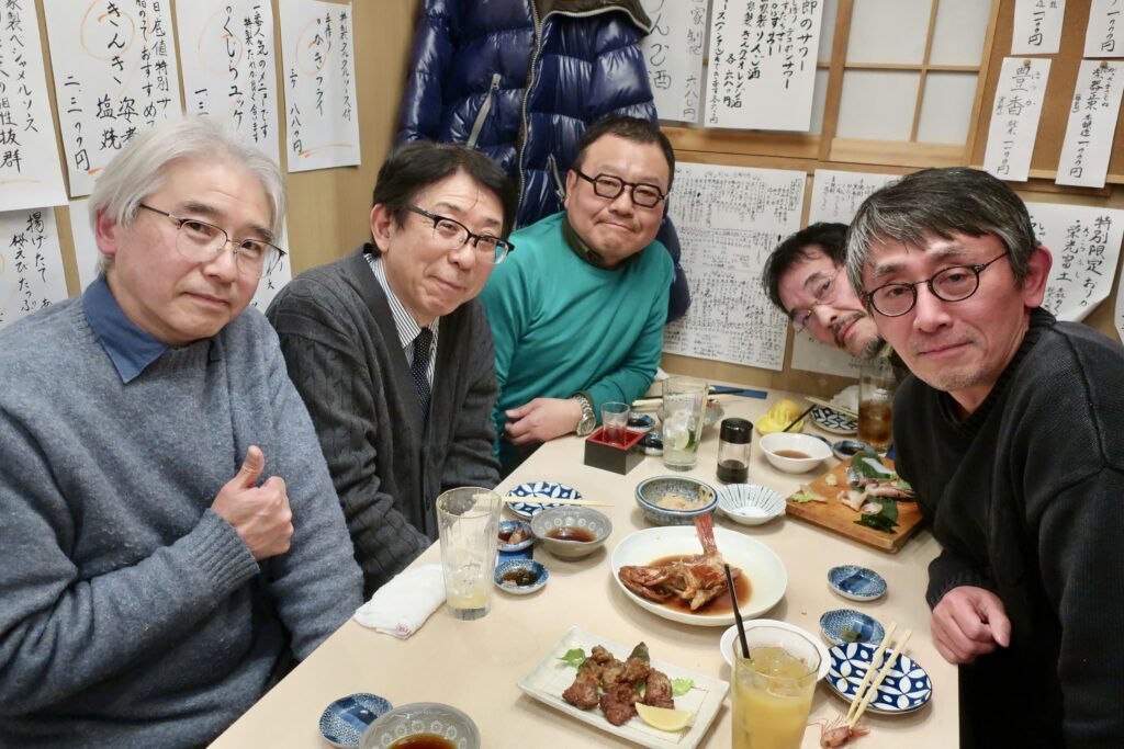 冬は山にこもるシーズンなので、その合間を縫って東京に短期間だけ戻るとなると宴席が続くことがある。今回も御多分に洩れず。2月5日に山ごもり第3クールを終え、戻ってくるなり6日には古い友だちと高田馬場の飲み屋でテーブルを囲んでいた。古い友だちとは文学部1年ドイツ語Q組のクラスメートたちである。還暦の声が聞こえてきて、日々の暮らしの重心が仕事から離れてくると、どこからともなく「そうそう、あいつはどうしてるんだろう」という気持ちが湧いてくる。サークルやゼミを共にした仲間と交友が続くというのはよくある話、しかし「語学クラスの友だちと今もつるんでいる」てえのはあまり聞いたことがない。私たちの場合、聴く音楽の傾向がニッチで趣味があった4人組が大学入ってすぐに仲良くなって、ずっと疎遠となっていたけれど3年半ほど前にお互いまた連絡を取り合える環境が整って、一年に三度ほどそろって食事をしたり、全員いっしょにではないが声かけあって共にライブに足を運んだり、考えてみれば昔と変わらない遊び方が再開した、とまあこういうわけだ。その度にやはり「あいつはどうしてるんだろうな」と他のクラスメートが話題に上ったりする。ということで今回は、一人の友だちがFBで繋がっていた他のクラスメートを誘ってみたのだが、呼ばれた方はというと喜び勇んで駆けつけてくれた。どう勘定したってほぼ40年ぶりだ。