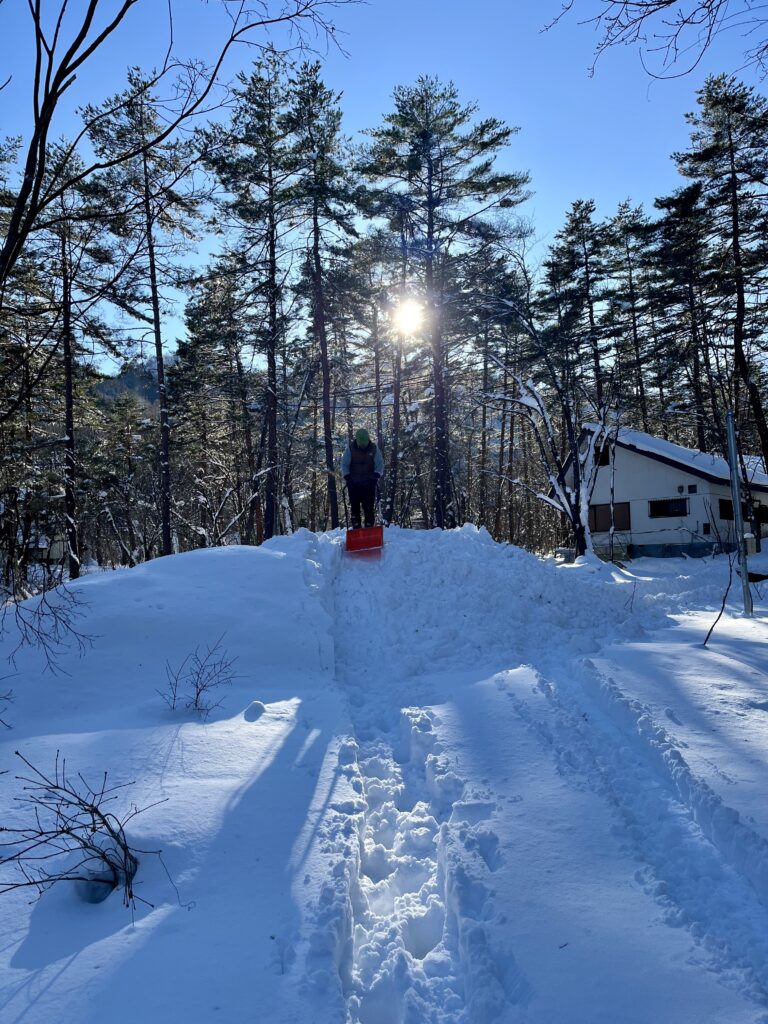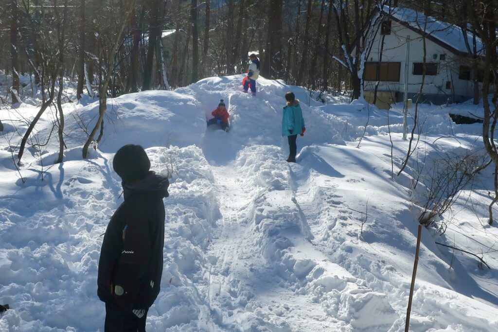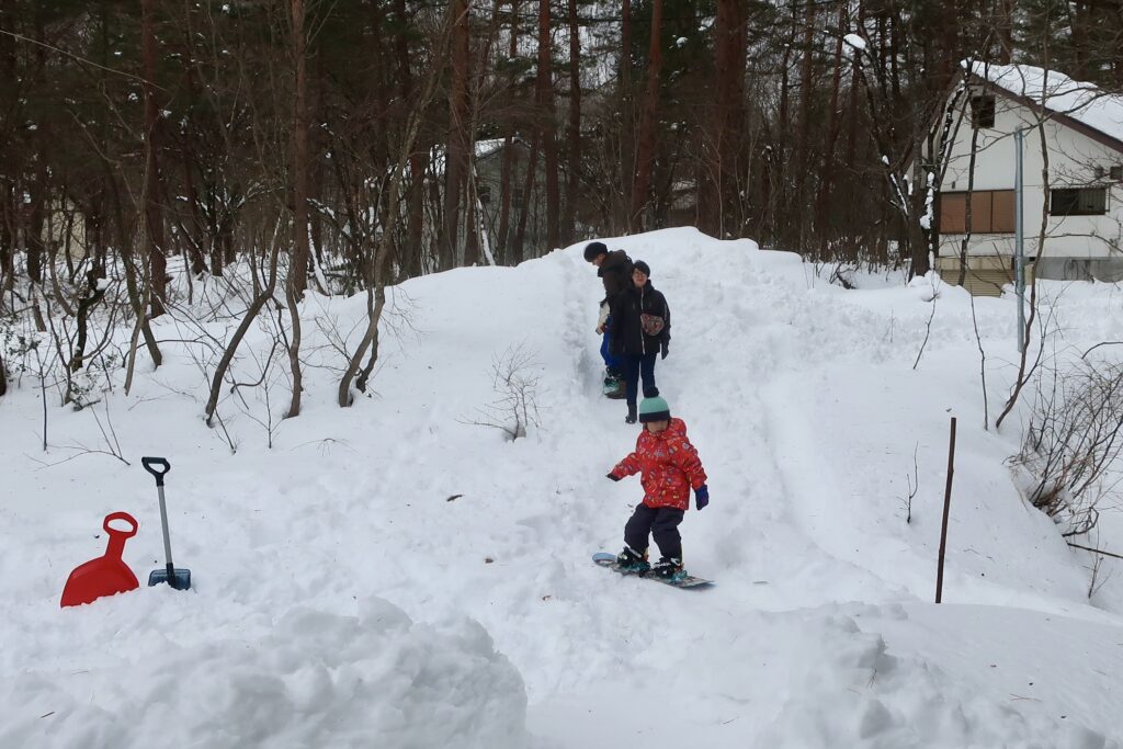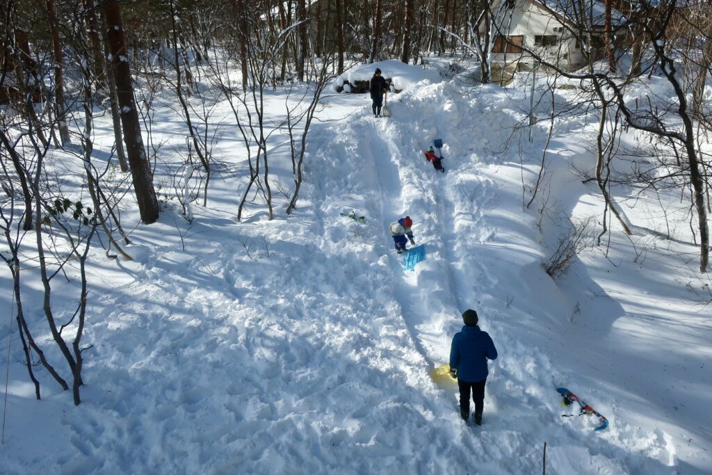 隠居たるもの、子どもの歓声に相好を崩す。2026年1月12日、「この冬最強」との称号をもって注意喚起された寒波は、朝方に吹き荒れた暴風とともに過ぎ去った。3連休の最終日となるこの日、宇都宮と東京から白馬に集結した一族郎党それぞれは、居住地に向かって昼前に出立する手筈となっている。玄関口の駐車スペースに停めてあった車はたったひと晩のうちにすっかり雪に埋もれた。それゆえ風がやんでから祖父、大叔父、父の男衆は各々シャベル片手にせっせと車を掘り出していたわけだが、寸暇を惜しむ姪孫(てっそん)たちはその横で雪遊びに余念がない。7歳、6歳、5歳、年子の姉兄弟のように育ついとこ3人がそろうと兎にも角にもかしましい。私たち夫婦は寒波と彼らの襲来に備え、庭に格好のプレイグラウンドをこしらえておいた。名づけて「散種荘スキー場 デンジャラスコース」、これがどうして、なかなかにスリリングなプライベートコースだったのである。