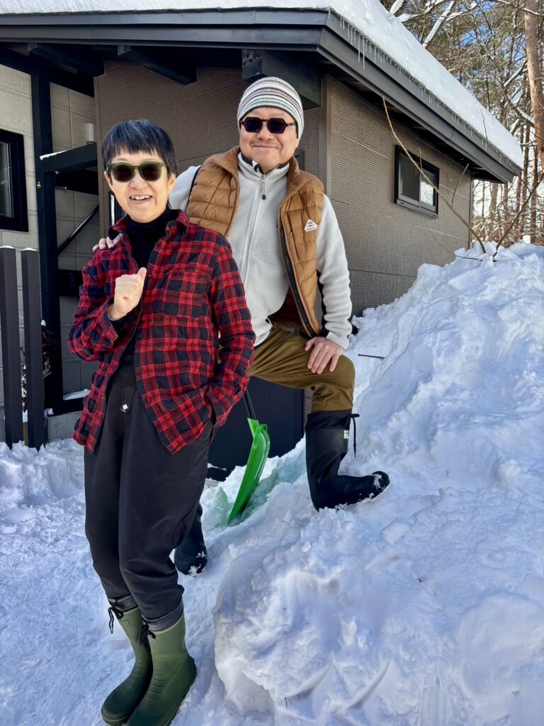 姪孫たちは帰りギリギリまでしつこくデンジャラスコースに遊び興じた。「あと一回!」といつまでもやめないから義兄が「それじゃあ、置いていくよ!それともここのうちの子になる⁈」と嗜めると、年かさの女の子はつれあいと目を合わせ「まんざらでもない」という顔をした。姪孫たちの歓声が響き渡っていたのか、彼らが帰ったあとになって散種荘の前を通りかかる子どもたちはみな、表からは見えない庭の方に首を伸ばした。最強寒波が去って穏やかな冬の昼下がり、「デンジャラスコースっていうんだ。試してみるかい?」、私たちは散種荘スキー場を近所の子どもたちに開放した。姪孫たちが帰ってからもしばらくは、子どもたちの歓声が我が庭にこだました。数時間後、出発する車を見送る私たちを撮った写真を義姉が送ってくれた。ああ、もうすぐ隠居の身。その姿は雪山に暮らす初老の夫婦そのものだった。