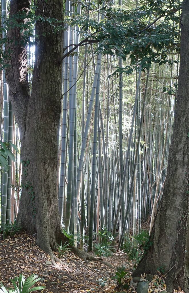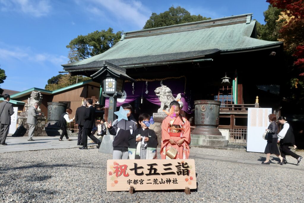 隠居たるもの、未知の社殿をほっつき歩く。2025年11月16日大安、きれいに晴れて暖かい秋の日、私たち夫婦は塀の外を取り巻く竹林のそこそこ急な斜面を下っていた。栃木県は宇都宮市街に鎮座まします二荒山神社である、竹林といえど静謐というわけもなく、ドラムを叩くような音がどこからかくっきり聞こえてくる。場違いな音を耳にしつつ首をかしげながら下りきってみると、目の前の開けた広場にタープが組まれていて、高校生と思しき男女数人がたむろしていた。なるほど、ここでこれから数組による「バンドフェス」が始まるようだ。文化祭シーズンが終わり、それだけではもったいなくて、もっと披露する場がないか求めてこういうことになったのだろう。微笑ましい、青春である。とはいえ彼らの演奏がスタートするのを悠長に待っている場合ではない。七五三の祈祷がそろそろ終わり、姪孫二人が本殿から出てくる。