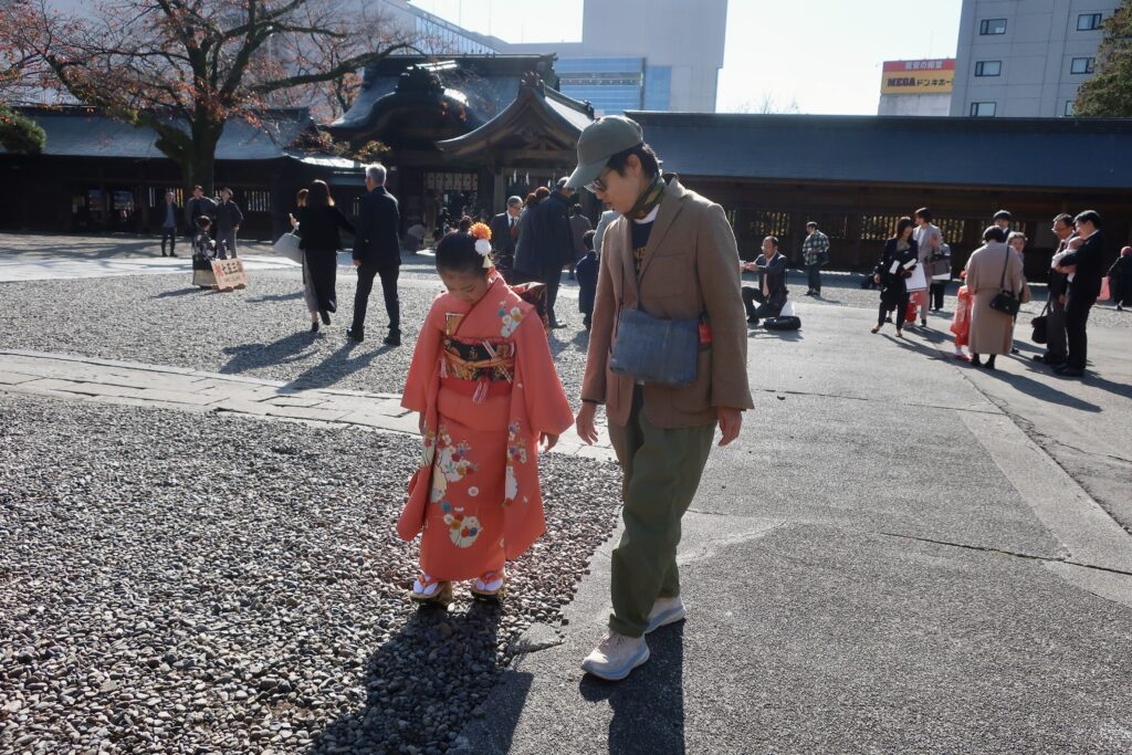 「七五三の時節の日曜日にしては空いている」と義兄。混雑を避けそれぞれの都合にあわせて10月から11月ごろの週末どこかを選ぶのが今般のトレンドだそうだが、伝統的には11月15日に行う行事、確かに義兄が口にするとおり、その翌日となる16日なのだからもっと混雑していてもおかしくはない(これも少子化の影響なのかと勘ぐりたくもなる)。そこにもってきてこの妙に暖かい陽気。ついのどかな心持ちになって身体も弛緩しがち。そこにいささかなりとも異なる「空気感」を注入するいかつい一団がいた。アルファードとベルファイアをつらねてやって来たふた家族(もしかしたら七五三を迎えた子どもの父親同士が兄弟?)、孫を祝いにそこに加わる祖父母、これがそろいもそろって見事なほどにいなたいヤンキー臭を撒き散らす。しかし、神社前の広場で開催される高校生たちのバンドフェスしかり、本来なら周囲にピリッとした「緊張感」が漂ってもおかしくないところ、さすが北関東の地方都市、清々しいほどに呑気でそれがない。なんというか伝統は今も受け継がれているのである。
