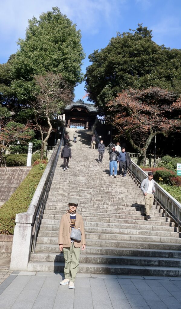 日光の二荒山さんを訪れたことはあるものの宇都宮市中のこちらは初めてだった。この街で暮らす姪の娘と息子が今年それぞれに7歳と5歳になり、年恰好からして当然のこと同時に七五三ということになり、その祝いの食事会およびお参りにお誘いいただいたのだ。食事会を前夜に終えて泊まった翌日、好天に恵まれた日曜日の午前にこうして皆で馳せ参じたというわけだ。高校生たちから目を離し「さて、そろそろ神社に戻ろうか」と身体を翻す。そして初老二人はおののいた。急勾配の石段が想像以上に長い。裏から車で登ったところにある駐車場からそのまま入り、社殿の外郭となる竹林をたどって回り込むように下りたからはっきりと気づかなかったのだが、この神社、小高い丘の上に建っていた。やれやれ、下りたからには上らなくてはならない。