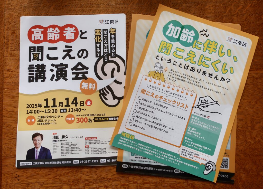翌日に宇都宮行きを控えた11月14日、私たち夫婦はそこそこに忙しかった。まず午前中、友だちが勤めるインポートアパレル商社が主催するファミリーセール会場に足を運び、せっかく神保町に来たのだからと昼に共栄堂に立ち寄りスマトラカレーを食す。午後になって地下鉄を乗り継ぎ東陽町に移動、江東区役所に隣接する文化センターで開催される「高齢者と聞こえの講演会」の末席に陣取る。上の写真にあるチェックリストに✔︎が三つ、おそらく加齢が原因である以上それらが大きく改善することはなかろうが、不便を和らげる有効な対処法があるのでは?、そう期待してのことだ。切実な高齢の区民で埋まった会場、おそらく受講者中で私たち夫婦が最年少だった。それでは何らか対処法を体得できたのかというと、そうした期待はあっけなく裏切られる。そもそもある段階を過ぎてしまったら「補聴器を適切に使用すること」以外に有効な対処法なぞなく、なのにこの国においてはそれがないがしろにされていること、それを啓蒙することこそが主眼の講演会だった。これがまた目から鱗で大変に興味深かったのである。